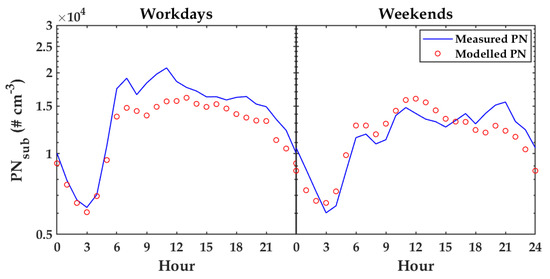 The median of diurnal cycles calculated on workdays and weekends for measured PN and modeled PN (No. 26).
