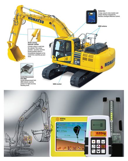 - Shimano, Y.; Kami, Y.; Shimokaze, K. Development of PC210LCi-10/PC200i-10 Machine Control Hydraulic Excavator. Available online: https://home.komatsu/en/company/tech-innovation/report/pdf/167-E01.pdf (accessed on 17 May 2020).