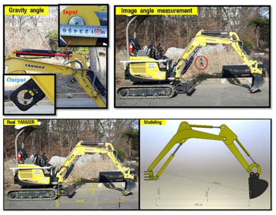 The 3D CAD model was made for validation of the derived equations through the simulation of end-point estimation by inputting the sensors’ output data of cylinder length and joint angle from link motions. In fact, the specifications of Vio-17 were not provided as they are a confidential asset of the company, thus the CAD model was done through manual measurement. Therefore, to correct errors in manual measurements, the produced CAD model must be verified. First, real , , and were measured by using both the protractor and imagery (Figure 4). In the case of the image method, the excavator must be photographed from the side without inclination for making the two-dimensional space absolute. Then, the image was inserted into the CAD utility for measuring the desired value [,].