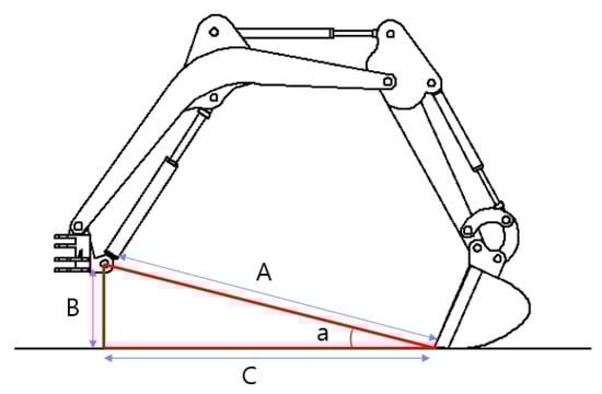 In the above section, , , and are necessary elements in estimating the position of the end-point. Thus, cylinder length must be converted to , , and through the derived mathematical equations. The most important parameters in converting to revolute joint angle are , , and , which are illustrated in Figure 3. can be derived by Equation (3), comes from Equation (4), and can be obtained using Equations (5)–(9).