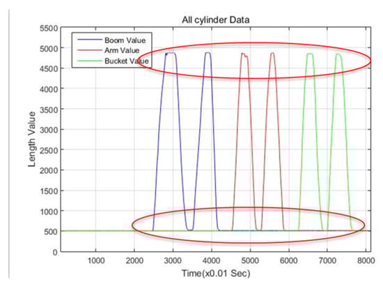 The graph showing the wire sensor’s output data of the maximum and minimum cylinder length related to each link.
