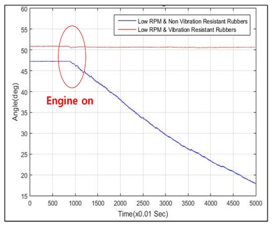Second, to estimate the end-point through the measurements of each joint angle displacements indirectly by measuring the rotation of links motion, a low-cost IMU sensor device was also selected named EBIMU-09DOF. This device can transmit the raw data so that the inherent characteristics of the excavator itself can be analyzed, and its specifications are explained in Figure 6. The price of one IMU sensor was about 180 USD. Thus, the total price of sensor devices for measuring the boom, stick, and bucket cylinder displacements was 540 USD. This is a very low-cost device. The cost range of IMU devices is very large. For example, the attitude/heading reference system (ARHS) device made by machine guidance company averages over 1000 USD. Brackets were made and installed on each link, as shown in Figure 9. In the case of boom and stick links, the brackets for fixing the IMU sensors were attached to the boom and stick link, as shown at the top of Figure 9. Finally, in the case of the bucket link, the bracket was fixed to two revolute joints of the four-bar linkage so that all IMU sensors could measure the absolute angle displacements of joints indirectly through calibration. The reason calibration is needed in this process is that the slopes of brackets and links are not the same. The angle displacements can be measured correctly through the calibration. The transmission cycle of the sensor systems was 10 ms. When brackets were installed on the link, the butadiene rubber was used for anti-vibration, which prevents the data drift. Figure 10 illustrates drift generation for when rubber was and was not used. This device transmits three kinds of data: roll, pitch, yaw. In general, roll data are the most robust to disturbance and have the widest measurable range [,]. Thus, the roll data were chosen for measuring the joint angle.