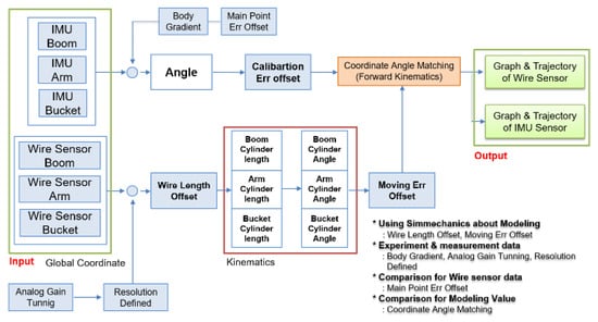 The four main poses of the excavator were chosen (Figure 12). Figure 12A is the middle point in the aspect of the horizontal side view. Figure 12B is the status when all links of the excavator are stretched as much as possible. Figure 12C is performed for making a maximum height. Figure 12D is when all cylinders have a minimum length. The IMU and draw-wire sensors measured the pose information for the poses in Figure 12A–D and then the logged data were calibrated to synchronize the initial and final points by inserting the offset value. This processed data were finally applied to the derived equations to estimate the end-point of the excavator. The entire process is shown schematically in Figure 13.