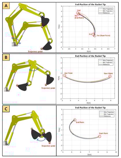 The characteristics of bucket tip were analyzed by measured data from draw-wire and IMU sensor during the motion of the boom, stick, and bucket, separately. In the analysis of the bucket tip, the non-motion part of joints was fixed for measuring the rotating part, and the reference trajectory was generated through the simulation created using Simulink. The length of the cylinder and joint angle displacements of the boom, stick, and bucket were checked in each experiment so that it was possible to know how well the end-point of the bucket followed the reference trajectory. A comparison between the results of the collected data and the reference bucket trajectories is shown in Figure 14. Figure 14A–C shows that the performance of the draw-wire sensor is better than the IMU sensor. By inputting the data from the draw-wire and IMU sensors, the result shows that the draw-wire sensor tracked the reference better than the IMU sensor. Table 4 includes the numerical evaluation with average error (cm).
