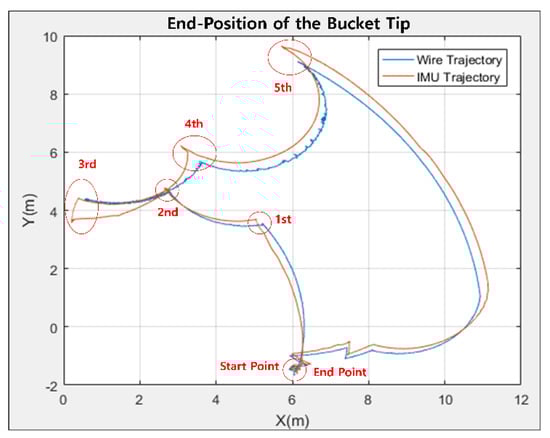 Experiments using wire sensors in a single rotation confirmed that the tip of the bucket followed the reference trajectory within 1 cm on both the x and y axes. In addition, the data measured by the wire sensor show that there is almost no change in the error of the trajectory created by the bucket tip during repeated operation. In contrast, the experiments with the IMU sensor showed that the error variance of the trajectory created by a bucket tip was larger than the draw-wire sensor. In simultaneous excavator operation, the IMU sensor measured a larger area of the closed trajectory than the wire sensor. At the third point in Figure 15, a time delay was observed to correct the accumulated error value of the IMU sensor. When measuring the cylinder length, the bucket tip trajectory was hardly affected by the disturbance caused by the movement and vibration of the excavator itself. The cylinder lengths of the boom, stick, and bucket were all measured independently by the sensor, and the independent data had almost no cumulative error compared to the IMU sensor. On the other hand, the method of measuring the rotation of the boom, stick, and bucket links was evaluated to be vulnerable to disturbance of the excavator’s own movement and vibration because the sensor data are measured based on the Earth’s gravity. Since the data of boom, stick, and bucket are all dependent, the bucket tip can be recognized with a cumulative error.