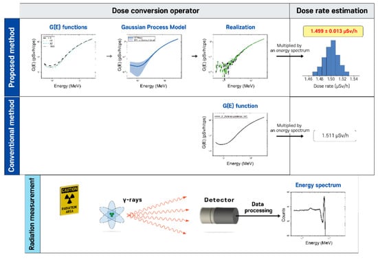 This study presents a new spectrum-to-dose conversion operator concept, called functions, which are functions based on Gaussian process (GP) regression that account for the relative response to radiation energy and direction of radiation incidence in order to deal with uncertainty in dose rate estimation. A GP model can be constructed using all the data points of functions determined under various irradiation geometries, e.g., the angles of incidence of 0°, 45°, and 90°, and isotropic geometry. Then, a set of functions can be obtained through independent realizations (or equivalently, sample path) of the GP model, where each realization defines a conversion factor for every possible energy step. Lastly, the obtained functions are multiplied by an observed spectrum to make it possible to estimate the mean dose rate value and its associated uncertainty. Figure 1 illustrates the proposed concept in comparison with the conventional method. This paper presents simulation results that demonstrate the behavior and performance of the proposed approach. It is worth noting that although this study focuses on the ambient dose rate, this method can be applied to any dosimetric quantity (e.g., air kerma) if the target quantity is defined as a function of radiation energy.