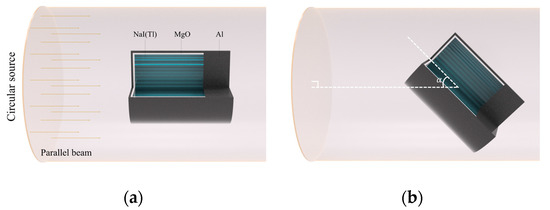 A Monte Carlo N-Particle Transport Code (MCNP6) [21] was used to validate the proposed method. A schematic of the MCNP6 model used for simulations is illustrated in Figure 2. The 5.08 5.08 cm (diameter height) NaI(Tl) crystal with a density of 3.6 g cm−3 was covered by a MgO reflector with a density of 2 g cm−3, which was surrounded by aluminum with a density of 2.7 g cm−3. A 20-mm-thick aluminum plate was placed behind the crystal to mimic a phenomenon where photons are scattered or backscattered in a photomultiplier tube [22]. This is a reasonable assumption because it considers the scattered effects of the photomultiplier tube on a spectrum as the angle of irradiation direction changes. A parallel beam of photons distributed over a circular source was irradiated on the NaI(Tl) detector. In order to obtain functions under various directions of irradiation, the directions of the detector were rotated against the circular source by specific angle (i.e., 0, 45, and 90), where subscript is the irradiation geometry that determines the function. For isotropic geometry, the detector was centered inside the spherical source, emitting fully isotropic irradiation of photons.