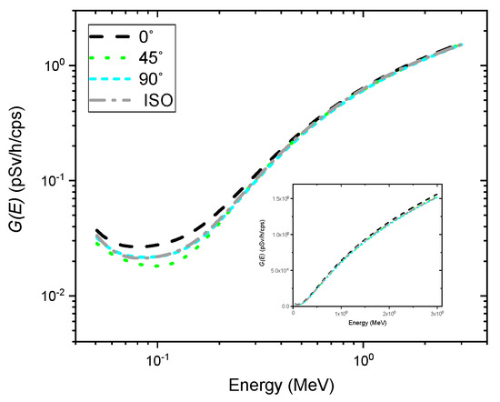 Figure 3 shows the determined functions of the NaI (Tl) detector as a function of energy deposited in the crystal under four different irradiation geometries. As expected, the function, i.e., function for the angle of incidence of 0, tended to yield higher values over the entire energy range than those for other directions of photons with respect to the detector axis. Additionally, there were relatively small differences between the values of functions for energies above 200 keV, showing good agreement with previous results [9,12]. This could be ascribed to the fact that the energy deposition of relatively high energy depends primarily on the volume of the crystal. On the other hand, the values of the functions obtained from different types of irradiation geometry tended to relatively disperse, especially for energies below 200 keV. This is because the photons in that energy range have high interaction probabilities with the crystal, so the energy deposition in the crystal becomes proportional to the projected area of the crystal incident surface. These results suggest that the estimated dose rate may drift from the true value, especially in the low energy range, depending on the functions calculated by different types of irradiation geometry.