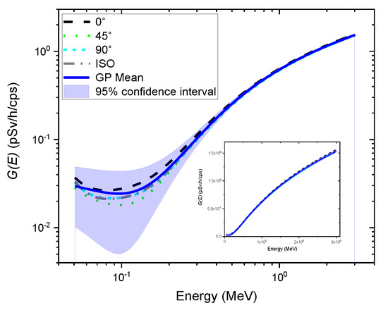 Figure 4 shows the posterior mean of the GP model as well as its probabilistic nature in the form of a 95% confidence interval using the data from previously-determined functions; the functions are also illustrated in this figure for comparison. The result shows that the GP model no longer has a single value for energy but a distribution (i.e., Gaussian distribution) indexed by energy. In addition, the entire data points of functions determined under different types of irradiation geometry were found inside the 95% confidence region of the posterior. In particular, the relative vertical width of the confidence region with regard to the mean value tended to increase as it moved to the low energy range, especially for energies below 200 keV, to account for variations induced by radiation energy and direction of radiation incidence. It should be noted that the absolute values of the confidence region obtained from the GP model over the entire energy range are almost similar.