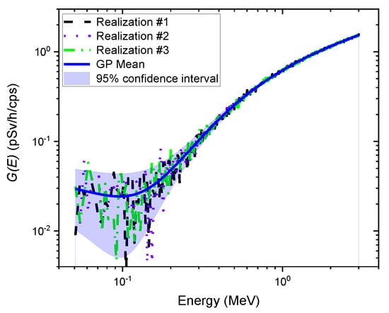 Figure 5 shows an example of independent realization functions (i.e., functions) randomly sampled from the GP model. As expected, each function represented a different path because of the randomness of the stochastic process, fluctuating around the mean of the GP model. This implies that multiple dose rate values can be calculated using the functions multiplied by the observed spectrum, resulting in not only the best dose rate estimate but also its uncertainty, which might contain the true value. The mean of the GP model was lower than that of the function, which generally overestimates dose rates, so it nearly coincided with the function (see Figure 4). That is, the mean dose rate values and the dose rates estimated by the function might be in good agreement. This result is quite promising because isotropic geometry can be a reasonable assumption for irradiations often received from naturally occurring radioisotopes in homes or the surrounding environments [9,16].