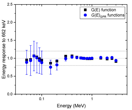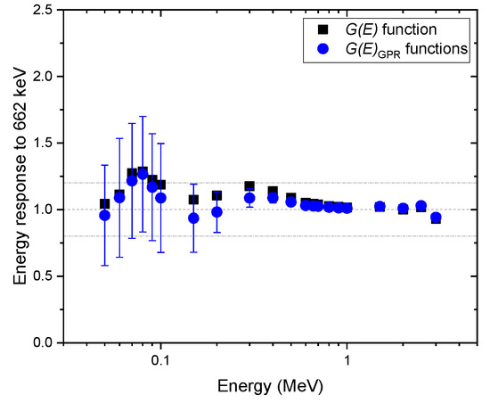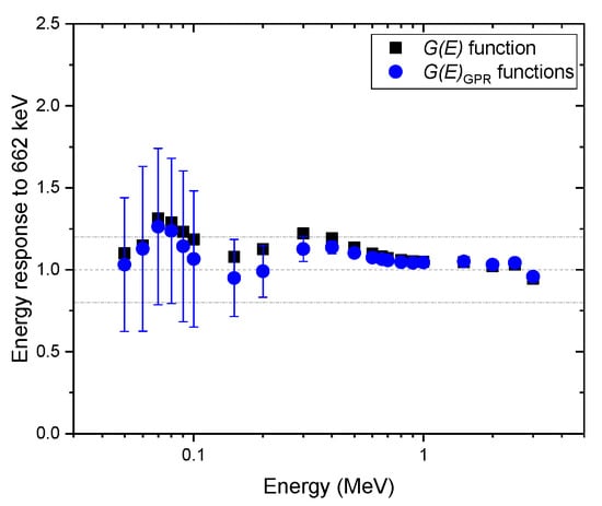 Figure 7, Figure 8 and Figure 9 show the same comparison of energy response for the spectra obtained at the angles of incidence of 45 and 90 and isotropic geometry. Although similar trends were observed in the non-zero angle of incidences, the estimated dose rate values obtained with the function were overestimated, especially for energies below 600 keV for all geometries in which the test spectra were acquired, which was expected. This shows the reason that the function is generally used to provide conservative dose estimates. In particular, the dose rate overestimation for the test spectra, assuming that photons were irradiated under the angle of incidence of 45°, is as high as 50% at 70 keV (see Figure 7). This is because the largest projected area of the crystal incident surface is generated at that specific angle, which increases interaction probabilities, especially for photons at low energies. Likewise, the mean values of the dose rate estimate, with functions, showed similar trends but were less overestimated. Furthermore, the uncertainties of those estimates included not only the conservative values estimated by the function but also the true values in most situations. The uncertainty calculated by the proposed method is much more reliable than those that provide only a point estimate, because in the real world, it is not possible to know how far an estimate is from the true value.