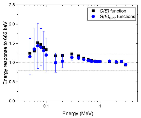 To validate the proposed method, various spectra were obtained for mono-energy over the range of 50–3000 keV at certain intervals with various geometries, e.g., the angles of incidence of 0°, 45°, and 90°, and isotropic geometry. To calculate the uncertainty of the dose rate (i.e., 95% confidence interval), 100 functions were randomly sampled from the GP model each time. Figure 6 shows a comparison of the energy response normalized to the energy of 622 keV emitted by Cs-137, estimated with functions and the function for the spectra obtained at the angle of incidence of 0°. Here, the energy response was calculated by having the ratio of the estimated dose rate to the true dose rate at certain energy divided by the same ratio at the energy of 662 keV. That is, an increase in the value of the energy response suggests that the dose rate is overestimated, or vice versa. As we can see from the figure, the energy responses for the function were reasonably close to one, which means that the estimated values of the dose rate and true values were in good agreement. This is because the test spectra were acquired under the same condition used for the function calculation. These results are not as good as those that were reported by previous studies, especially for the low energy range. Nonetheless, it is worth emphasizing that the purpose of this study was to propose a concept that would make it possible to deal with uncertainty existing in the dose rate by taking into account the relative response of radiation energy and the direction of radiation incidence. For the dose rates estimated with functions, the mean values deviated slightly more from the reference value 0 for energies below 200 keV. The reason is that there might be a discrepancy between the mean values of functions sampled from the GP model and those from the function, which is better suited with respect to the test spectra. In contrast, the proposed method was able to provide the uncertainty and the mean of the dose rate. As expected, the relative uncertainty tended to increase with a decrease in energy. In particular, the relative uncertainty increased sharply for energies under 200 keV because the GP model had relatively wide intervals for that energy range. In addition, the 95% confidence interval of relative uncertainty mostly included the true value and the conservative values obtained with the function.