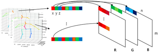 To use these CNN models as a classifier of action recognition, we converted the 3D joint input data coordinates x, y, z into red, green, blue pixel values of an RGB image, respectively, to form a single image. The shape of the joint from a video clip consisting of one action is an M × N × 3 matrix form of Equation (1), where M is the number of frames and N is the number of joints. In this study, we have used body parts such as hip, right hip, right knee, right foot, left hip, left knee, left foot, spine, thorax, neck/nose, head, left shoulder, left elbow, left wrist, right shoulder, right elbow, and right wrist, in the order of the output of 3D-baseline.