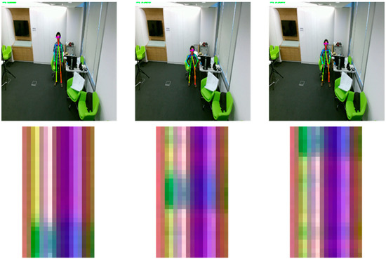 To convert these matrix values into RGB values, we extracted the values of x, y, z from matrix S, and normalized them in the continuous range from 0 to 255. After normalization, the converted RGB matrix from a single frame was 1 × N × 3, and by stacking the frames by column, we obtained a single image size of M × N with RGB channels as shown in Figure 3. In this study, we used a sliding window to generate a subsequence in a video clip that contains one action for data augmentation. We set the stride to 1 for the sliding window to get the predicted action label on each frame, and the window size to 30 frames to execute approximately one to two seconds of movement in an image. Consequently, the action label on the current frame is a result of the previous 30 frames. A converted image of a standing action sequence is depicted in Figure 4. During the action, we can locate the change of color in the columns.