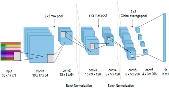 The classification of actions has been made easier by using 6 convolutional layers for using it in a real-time embedded system. As shown in Figure 5, it has a 3 × 3 kernel with padding 1 and stride 1. We have attached batch normalization [26] after the second and fourth layers for the distribution of outputs. In addition, after the second and fourth layers, a 2 × 2 max pool, and after the last convolutional layer a 2 × 2 global average pool was placed to reduce the size. To initialize weights for all convolutional layers, we have used Xavier initialization [27] and ReLu [28] as an activation function. In the final layer, k action labels were classified by a fully connected layer. To prevent overfitting, we also conducted dropouts after the first, third, and fully connected layers with a 70% probability.