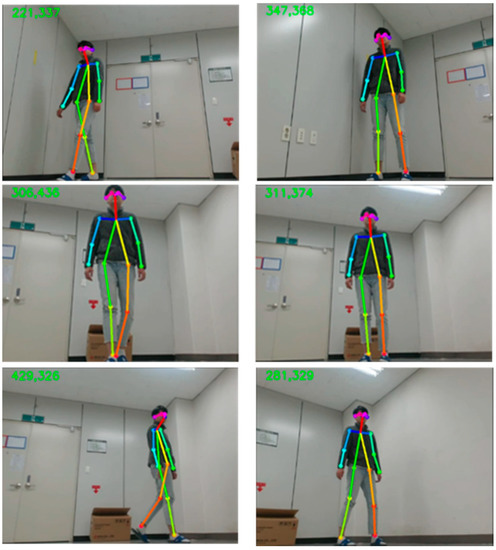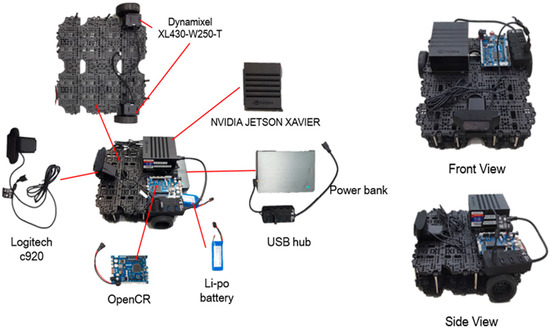 For the purpose of continuous detection and monitoring of a person’s action in the in-doors, we have placed a tracking algorithm in the mobile robot. The mobile robot used in the experiment consists of NVIDIA JETSON XAVIER board [29], OpenCR [30], ROBOTIS Turtlebot [31], and Logitech c920, as shown in Figure 6. Xavier board is an embedded Linux computer, which is the latest addition of the Jetson platform that enables robotic platforms in the field with workstation-level performance. It comprises a 512-core Volta GPU including 64 Tensor cores, 16 GB memory, and an 8-core ARM v 8.2 64-bit CPU. We performed the whole process of joint extraction and action recognition using this board at an average of 15 FPS To control Dynamixel motors [32], we used serial communication with OpenCR and Xavier board, and for tracking, we used the x coordinate of the center of mass of all the joints extracted from OpenPose and the y coordinate of the height of the detected person. These values were estimated from the embedded board and communicated to OpenCR on a serial circuit. The motors were controlled using the tracking algorithm to keep the detected person in the center of the camera screen and maintain the distance between the person and the robot.