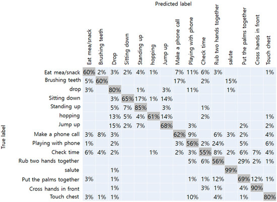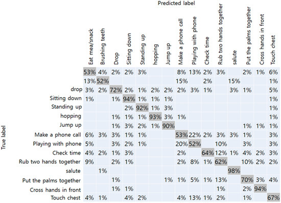 The results of the NTU-RGBD trained dataset are shown in Table 1. Original data from Kinect camera with a total of 25 joints showed the best accuracy of 75%. Because it had more joint coordinates than our method, more detailed joint information were assumed to improve accuracy. When the number of joints matched, Kinect data and RGB camera achieved an accuracy of 74% and 71%, respectively. From this result, we have confirmed that the performance of the RGB camera did not drop significantly than the Kinect camera. The confusion matrix with respect to the data obtained from the Kinect camera-17, and RGB camera, respectively, are shown in Figure 7 and Figure 8. In the figure, the vertical axis represents the true label of the NTU-RGB data, and the horizontal axis represents the labels predicted by the model. From the Kinect data, more distinct actions like a salute, and crossing hands in front showed an accuracy of 99% and 90%, respectively. While other similar actions using hands like rubbing two hands together, playing with the phone, and checking time showed an accuracy relatively less than 55%. In addition, the results of the proposed method showed high accuracy for distinct actions such as standing, sitting, hopping, and jumping. However, other actions, in particular, that mainly used the arm joints, showed less accuracy than the Kinect data. We presumed that the accuracy gap occurred because of the pose estimation performance of the OpenPose which was slightly lower than the Kinect camera. Further comparison with other state-of-the-art CNN models are shown in Table 2. The inference performance is different from the Jetson Xavier module power consumption. We measured the FPS on the MAX and 15W power modes. The VGG-19 network [38] has a fully connected layer with a size of 4,096, which consumes a large amount of computational memory, making it hard to classify the actions on the Xavier board. Other CNN networks have a skip connection for fast information flow; however, they still have a latency greater than that of our proposed network.
