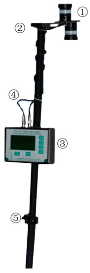 Portable three-band instrument of crop-growth monitoring and diagnosis: ① Multi-spectral crop sensor; ② Sensor support; ③ Processor system; ④ Shielded cable; ⑤ Level.