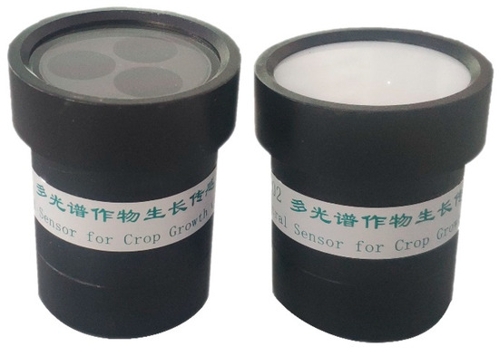 The multi-spectral crop sensor was structurally divided into an upward light sensor and a downward light sensor. The upward light sensor could receive sunlight radiation information at 660, 730, and 815 nm bands; the downward light sensor is composed of three detector lenses for detection at characteristic wavelengths of 660, 730 and 815 nm, respectively. The design of the upward light sensor and the downward light sensor could correct the spectral reflectance in real time, avoiding the influence of sunlight on the monitoring accuracy. Each detector lens consists of a spectral filter and photoelectric detectors. To obtain the reflectance values of the crop canopy at 660, 730 and 815 nm bands, the radiation information is processed after being converted to electrical signals through the photoelectric detector. Multispectral sensors are shown in Figure 2. The simple and unique structural design of CGMD led it to exhibit a better cost performance than other commercial instruments, so this instrument has high application potential.