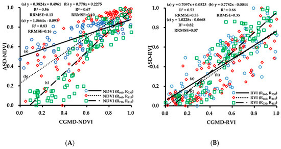 To evaluate the performance of the CGMD instrument in obtaining vegetation indices, regression analysis was performed on the corresponding values of NDVI, RVI, DVI, TVI obtained by the CGMD instrument in each growth period. To facilitate the comparison and analysis of the fitting accuracy of the combined vegetation indices of different wavebands, the vegetation indices obtained by FieldSpec HandHeld2 and CGMD were normalized. As shown in Figure 5, the fitting results of the vegetation indices obtained by CGMD and the corresponding values obtained by the commercial instrument FieldSpec HandHeld2 have a linear relationship, but some differences can be seen in the fitting accuracy of different vegetation.