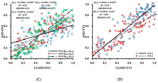 (A) Fitting curve of CGMD-NDVI and ASD-NDVI; (B) Fitting curve of CGMD-RVI and ASD-RVI; (C) Fitting curve of CGMD-DVI and ASD-DVI; (D) Fitting curve of CGMD-TVI and ASD-TVI.