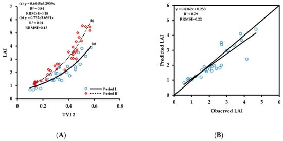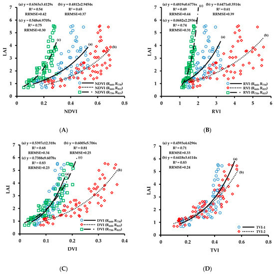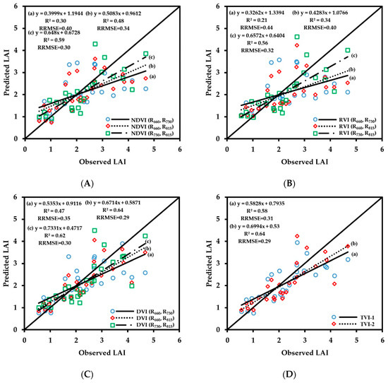 LAI refers to the total area of plant leaves per unit of land area, which is related to the size and structure of the plant canopy and is a comprehensive index reflecting the growth status of plants [31]. The fitting results of vegetation indices obtained by CGMD with LAI are shown in Figure 6. The number of samples used for the regressions was 63. Comparing the fitting results of each vegetation index with LAI, the correlation of fitting of the three-band vegetation indices TVI-1 and TVI-2 with LAI was high, with R2 values of 0.71 and 0.83, respectively, and RRMSE values of 0.33 and 0.24, respectively. Among them, the retrieval accuracy of TVI-2 on LAI was higher than those of most two-band vegetation indices. The fitting results of the two-band vegetation indices of different band combinations with LAI were different. The correlation of fitting of 730 nm/815 nm combination with LAI was the highest, and the R2 values were above 0.74. Among them, the fitting of DVI (R730, R815) was the best (R2 = 0.83, RRMSE = 0.23). The correlation of fitting of the 660 nm/815 nm combination was generally lower than that of the 730 nm/815 nm combination, and the fitting of DVI (R660, R815) was good (R2 = 0.81, RRMSE = 0.25); the 660 nm/730 nm combination showed the lowest correlation of fitting with LAI, the R2 values were lower than 0.68, and the RRMSE values were relatively high. In addition, the retrieval results of different types of vegetation indices exhibited differences. The fitting of DVI with LAI was better than that of NDVI and RVI in general (R2 > 0.68, RRMSE < 0.34).