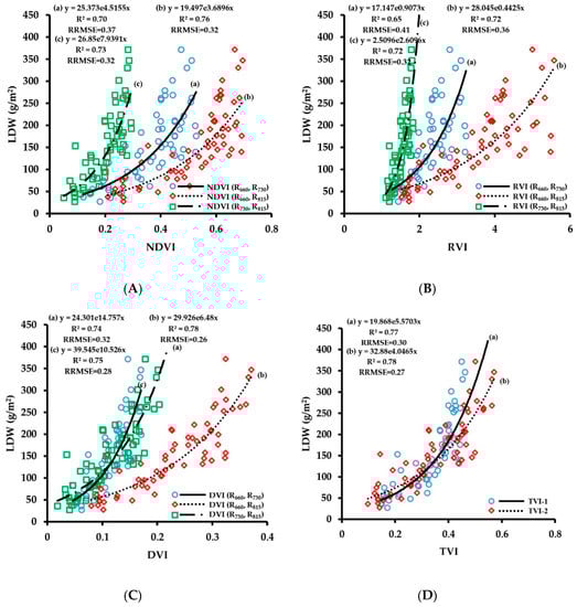 LDW refers to the dry weight of leaves per unit area and is an important index of plant growth. The fitting results of vegetation indices obtained by CGMD with LDW are shown in Figure 8. The number of samples used for the regressions was 63. The experimental results showed that the fitting accuracy of the vegetation indices constructed in this paper with LDW were relatively high (R2 > 0.65). The correlation of fitting of the three-band vegetation indices TVI-1 and TVI-2 with LDW was higher than that of most two-band vegetation indices; R2 values were 0.77 and 0.78, respectively, and the RRMSE values were 0.30 and 0.27, respectively. Comparing the retrieval results of LDW using the two-band vegetation indices, the 660 nm/815 nm band combination and the 730 nm/815 nm band combination showed good fitting results with LDW; R2 values were above 0.72. Among them, the fitting result of DVI (R660, R815) with LDW was the best; the R2 value was 0.78, and the RRMSE value was 0.26. The red spectral band effectively improves the accuracy of CGMD to retrieve LDW.