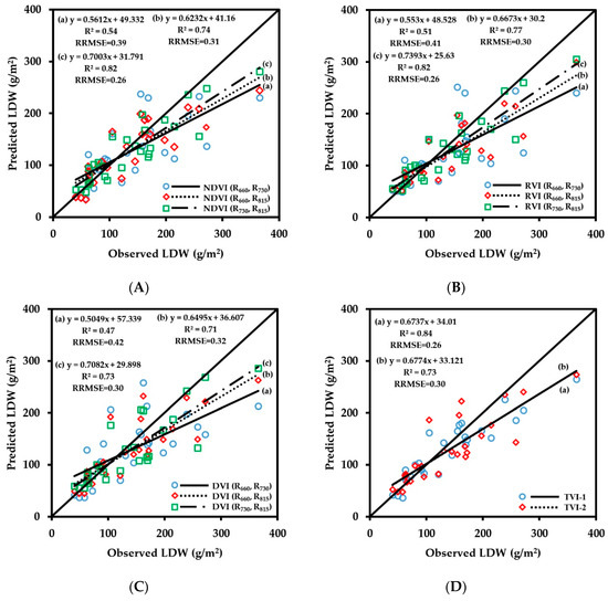 The verification results of the LDW monitoring model are shown in Figure 9. The number of samples used for the verification was 28. The three-band vegetation indices and the two-band vegetation indices of 660 nm/815 nm and 730 nm/815 nm combinations showed relatively high prediction accuracy for LDW, with all R2 values being above 0.71 and RRMSE values being less than 0.32. Among them, the prediction accuracy of TVI-2 was the best; the R2 value reached 0.84, and the RRMSE value was 0.26. The LDW index reflects the number of leaves in a unit area. The red spectral band also contains the LDW information, and the addition of TVI-1 in the red spectral band effectively improves the monitoring accuracy of LDW. The wheat LDW monitoring model also produced saturation under the large value condition. The verification results showed that the monitoring model had a low prediction value when the LDW value was greater than 200 g/m2 and the accuracy of the LDW prediction for large groups needs to be improved.
