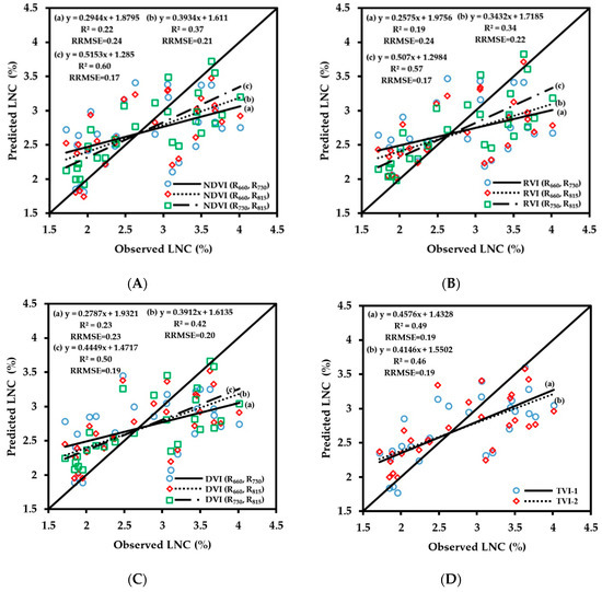 LNC is an important nutrient index reflecting crop growth, and obtaining crop LNC in real time can help guide variable-rate fertilization in the field. The fitting results of vegetation index obtained by CGMD with LNC are shown in Figure 10. The number of samples used for the regressions was 63. The correlation of fitting of vegetation indices with LNC was lower than those of other growth indices. The fitting results of three-band vegetation indices TVI-1 and TVI-2 with LNC did not improve the retrieval accuracy; the corresponding R2 values were 0.62 and 0.55, respectively, and the RMSE values were 0.15 and 0.17, respectively. Comparing the correlation of fitting of the two-band vegetation indices with LNC, the 660 nm/730 nm band combination had a poor fit with LNC, with R2 values of below 0.49, which was not suitable for LNC monitoring. The fitting results of the vegetation indices of 660 nm/815 nm and 730 nm/815 nm band combinations with LNC were relatively good; the range of R2 was 0.53–0.64, and the range of RRMSE was 0.15–0.17. Among them, the correlation of fitting of NDVI (R730, R815) with LNC was the highest (R2 = 0.64, RRMSE = 0.15).