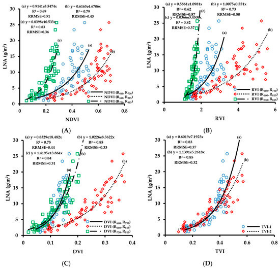 Fitting curve of NDVI (A), RVI (B), DVI (C) and TVI (D) to LNA of wheat.
