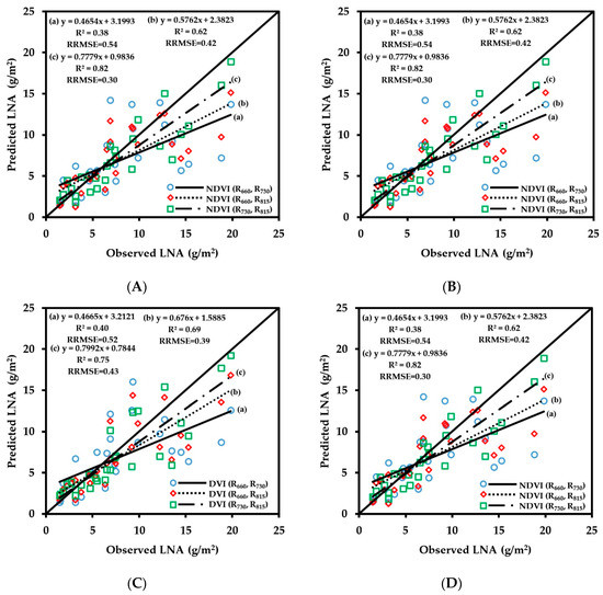 The relationships between observed and predicted LNA values of wheat varieties based on NDVI (A), RVI (B), DVI (C) and TVI (D) models.