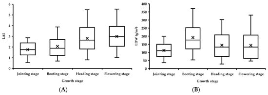 The LDW value of wheat increased greatly from the jointing stage to the booting stage; the average value increased from 112.13 g/m2 to 191.48 g/m2, and the value range increased from 36.56–199.52 g/m2 to 53.35–371.49 g/m2. The value from the booting stage to the flowering stage was relatively stable, the value from the booting stage to the heading stage decreased, and the average value decreased from 191.48 g/m2 to 144.05 g/m2. The value range at the booting stage was 27.83–302.18 g/m2. The value from the booting stage to the flowering stage remained the same. The average value at the flowering stage was 143.03 g/m2, with a range of 46.64–330.31 g/m2. Therefore, the jointing stage alone was defined as period I, and the booting stage to the flowering stage was defined as period II.
