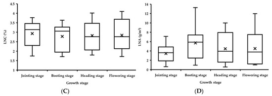 LNA is a growth index obtained by multiplying LNC and LDW. Its trend of change includes the characteristics of LDW and LNC. There was a large change in the value from the jointing stage to the booting stage, the average value increased from 3.45 g/m2 to 5.70 g/m2, and the range increased from 0.64–7.13 g/m2 to 0.94–13.27 g/m2. The values from the booting stage to the flowering stage tended to be stable. The average values were 5.70 g/m2, 4.47 g/m2, and 4.51 g/m2, respectively, and the values ranged from 0.94–13.27 g/m2, 0.55–10.00 g/m2, and 1.03–11.97 g/m2, respectively. Therefore, the jointing stage alone was defined as period I, and the period from the booting stage to the flowering stage was defined as period II.