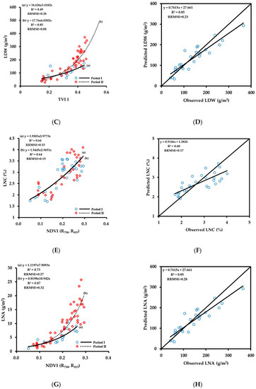 Fitting curves of vegetation index to LAI (A), LDW (C), LNC (E) and LNA (G) of wheat at periodI and periodII; The relationships between observed and predicted LAI (B), LDW (D), LNC (F) and LNA (H) values based on the multi-stage monitoring model of wheat.