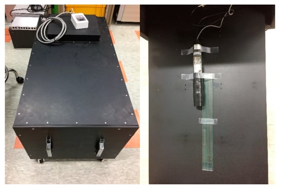 EJ-200 (cylindrical shape, dia. 30 × 50 mm, EJ technology) coupled with a PMT (R2228, HAMAMATSU) [20] and a preamp (E990-501, HAMAMATSU) [21] was used as a plastic scintillation detector. Optical grease (BC630, Saint-Gobain, Courbevoie, France) was applied at the junction between the crystal and PMT for optical coupling. For optical shielding, the crystal was wrapped with Teflon and black friction tape. A pulse processor (DP5G, Amptek, Hawthorne, NJ, USA) was used as a shaping amp with time constant of 2.2 μs and multichannel analyzer. A high-voltage supplier (NHQ 224M, ISEG, Lisboa, Portugal) was used to supply operating voltage to the detector. Experiments to measure gamma spectra were conducted in an aluminum dark box for the replenishment of optical shielding. The dark box consisted of a 10 mm thick aluminum case with an internal space of 440 × 440 × 899 (W × H × L) mm. The detector was placed on the shelf of the dark box, and the window of the detector was located at the center of the dark box. 22Na, 60Co, 133Ba, and 137Cs were used as gamma ray sources, and the position of the source was fixed at 5 cm from the detector window. Figure 2 shows our experimental setup. Energy calibration was conducted using a parametric optimization method [22].