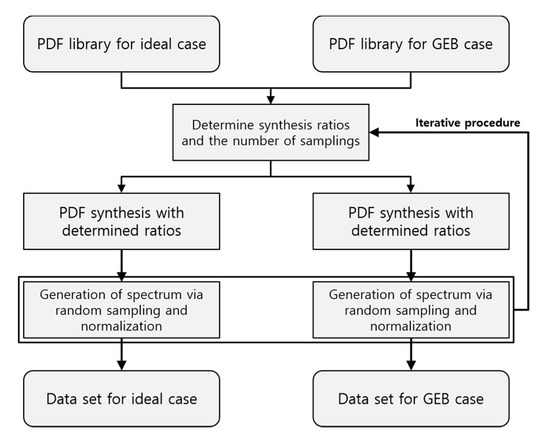 In this manner, we established a procedure to generate datasets for the ideal case and GEB case paired with each other. Figure 3 illustrates the dataset generation procedure. With the established dataset generation procedure, we generated 60,000 spectra as a training set, 2000 spectra as a validation set, and 2000 spectra as a test set. Figure 4 shows the examples of the generated datasets.