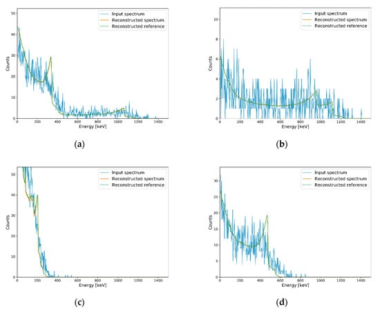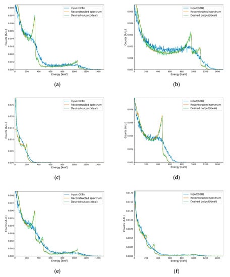 Similar to minimum detectable activity [29], the number of counts required to reconstruct Compton edges in plastic gamma spectra should be verified. In previous studies on gamma (or pseudo gamma) spectroscopy, similar concepts were defined to evaluate performance according to the activity of radioactive sources or the number of counts in their detection systems [12,30]. However, these cannot be used directly in our study because of the differences in their detailed concepts. Instead, averaged MAPE was used as a quality factor to evaluate the minimum reconstructible count (MRC) of the trained autoencoder. For each radioisotope, averaged MAPEs between reconstruction results and reconstruction references were calculated as follows. First, measured spectra in Section 3.2 (i.e., input spectra in Figure 8a–c) were normalized and utilized as PDFs for generating test sets for MRC evaluation. Second, 100 spectra were generated as test sets with the procedure detailed in Section 2.2 for each number of counts. Third, Compton edges were reconstructed for the test sets. Fourth, MAPEs between reconstruction results and reconstruction references were calculated for 100 generated spectra, and the averaged MAPE value was calculated. In this study, the reconstruction results presented in Section 3.2 (i.e., reconstructed spectra in Figure 8a–c) were used as a reconstruction reference. The threshold for MRC was determined as 10% of the averaged MAPE by referring to Table 1. Whole steps for MRC evaluation above were iterated with increment of the number of counts with interval of 50 for each radioisotope. Figure 9 shows the averaged MAPE according to the number of counts for single-isotope gamma spectra. MRCs were determined as the counts of which averaged MAPEs were decreased to less than 10%. Table 2 shows the MRCs of the single isotopes, and Figure 10 shows examples of generated spectra and reconstruction results corresponding to each MRC. In this table, MRCs are higher in order of 60Co < 137Cs < 22Na < 133Ba. The reason why MRCs are different depending on radioisotopes may be related to the intensities of energies of emitted photons and combinations of radioisotopes. 60Co emits two energies of gamma rays with almost analogous ratios. However, 22Na emits two energies of photons at different ratios; the intensity for a photon of 511 keV is almost double that for a photon of 1275.4 keV. This means that a higher number of counts is required to extract features for Compton edge reconstruction on the Compton continuum generated by a photon of 1275.4 keV. In the same manner, 133Ba requires the highest number of counts for Compton edge reconstruction due to the complex Compton edges in the low-energy region. In the case of 137Cs, the MRC was higher than the MRCs of 60Co, even though it emits one energy of gamma rays. It may because higher number of counts are required to discriminate following cases; one is 137Cs and the other is small ratio of 133Ba and 137Cs.
