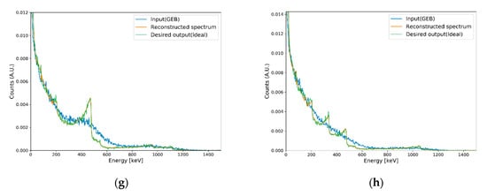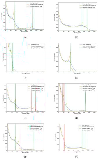 Results of Compton edge reconstruction for eight cases in the test set. Each synthesis ratio is (a) 100% 22Na; (b) 100% 60Co; (c) 100% 133Ba; (d) 100% 137Cs; (e) 70% 22Na and 30% 137Cs; (f) 50% 22Na and 50% 133Ba; (g) 20% 60Co, 20% 133Ba, and 60% 137Cs; and (h) 40% 22Na, 30% 133Ba, and 30% 137Cs.