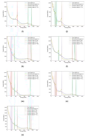 Results of Compton edge reconstruction for experimental data. Each figure represents measured spectra of (a) 22Na; (b) 60Co; (c) 133Ba; (d) 137Cs; (e) 22Na and 60Co; (f) 22Na and 133Ba; (g) 22Na and 137Cs; (h) 60Co and 133Ba; (i) 60Co and 137Cs; (j) 133Ba and 137Cs; (k) 22Na, 60Co and 133Ba; (l) 22Na, 60Co and 137Cs; (m) 22Na, 133Ba and 137Cs; (n) 60Co, 133Ba and 137Cs; and (o) 22Na, 60Co, 133Ba, and 137Cs.