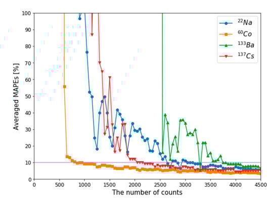 Averaged MAPEs according to the number of counts for single isotope gamma spectra.