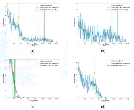 As shown in Figure 8, the energies of Compton edges in the reconstructed spectra were matched with their theoretical values calculated by Equation (4).