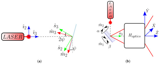where, as expressed in the last row, is just the third component of the normal vector expressed in the laser source reference system . It depends on the scanning tilt angles and as well as the angle between the incident direction of the laser beam and the mirror surface . It can be seen that Equation (4) makes even more explicit the non-linear relationship between the scanning direction and the tilt angles and .