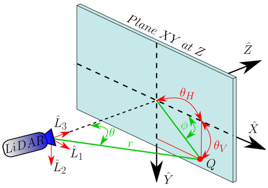Given a target point with known coordinates, its expression in LiDAR coordinates is then as Figure 2 represents. Since TOF resolves the euclidean distance to this point, the most useful coordinate system is the spherical one. Thus, the point could be expressed as the previous Equation (1), .