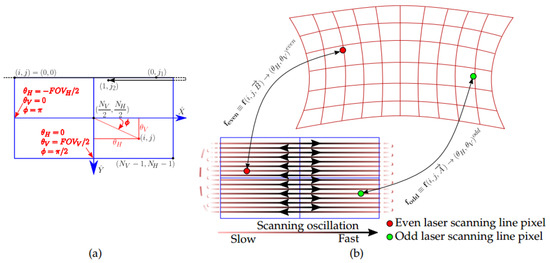 Moreover, radial symmetry is lost, so a proper distortion model is needed. For convenience, the fastest scanning direction, the horizontal, is split up by its two directions of motion in order to separate the strongest asymmetric behaviour of the MEMS. Thus, odd and even lines of the image are treated independently as two separate images yielding two independent distortion mapping functions and aiming to relate the pixel position in the acquisition frame (i,j) with the resulting viewing angles and . They are defined in Equation (9) and shown in Figure 3b.