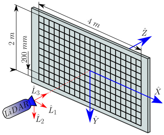 In order to obtain the set of measurements, a regular grid of dimension 4 × 2 m with 200 mm width squares was constructed onto a planar wall with absorbent optical duct tape as depicted in Figure 4. Then, the LiDAR prototype is placed at a known Z distance facing the pattern so both viewing angles can be resolved using Equation (5) for all the scanned grid’s intersections.