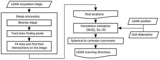 The scheme in Figure 5 describes the step-by-step procedure presented in pseudocode in Algorithm 1, which was implemented in practice using Matlab© (Algorithm 1 was implemented using standard Matlab© functions from the Signal Processing, Computer Vision and Optimization libraries.). Recall that, for the calibration method we propose, we consider a frame of the scanning optics as an image composed of even and odd scanning lines that we split in two images as discussed above and shown in Figure 3. Pixel locations from both odd and even images are obtained with sub-pixel resolution after doing line-detection using image processing, which includes a binarization of the image to work with the pixel locations corresponding to the black lines of the pattern, fitting them with two-dimensional lines on the image and calculating their intersections. Afterwards, these pixel locations in conjunction with the known grid dimensions and the LiDAR position, are introduced to an optimization solver according to the presented NLSQ problem of Equation (10) in order to estimate both and parameter vectors of the chosen mapping function. Finally, using the spherical description of the LiDAR scanning direction of Equation (7), the set of scanning directions are calculated from the mapped and . Thus, the generated point cloud is calibrated over the whole system’s FOV.