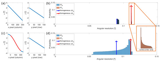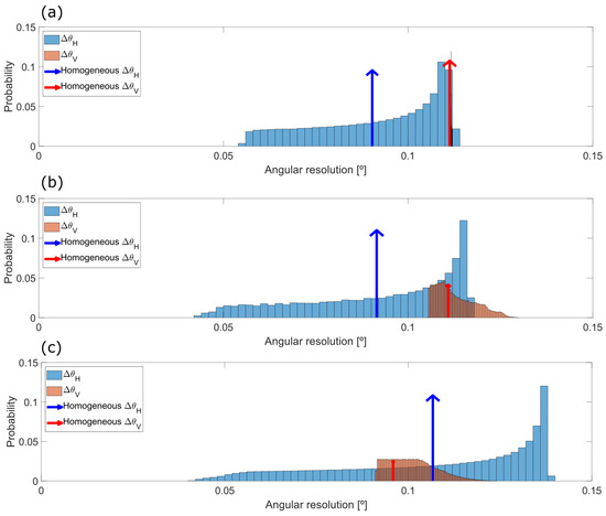 If the system was ideal and had a constant angular resolution, the probability of obtaining a given value of angular resolution would be a delta function at and at , as depicted with an arrow in Figure 7b. The wider the histogram, the larger the deviation from the ideal homogeneous, linear case, as depicts the case Figure 7d.