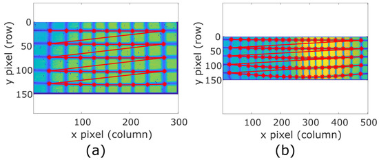 After simulating the model, we place the two prototypes being considered at a known distance of 3.8 m from the grid pattern described in Section 3, in order to test the calibration algorithm. The grid lines on the image are tracked and fitted, resulting in respectively 45 and 95 intersections for each LiDAR prototype as Figure 9 shows, which are the measured pixel positions .