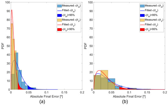 Probability Density Function (PDF) of both angular errors, (blue) horizontal and (red) vertical, of the odd lines for both (a) 30 × 20 FOV prototype and (b) 50 × 20 FOV prototype, using the mapping function Map 3 in Equation (13). The angular errors outside the 95% confidence interval are the filled areas.