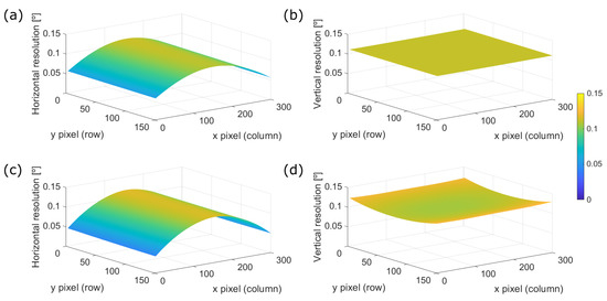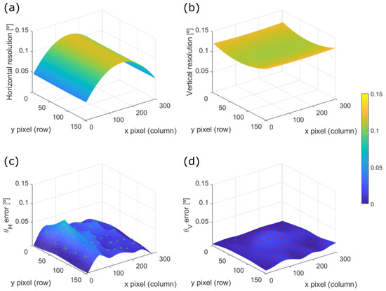 The committed angular error on the control points previously presented in Figure 10 can be fitted with a biharmonic spline in order to interpolate such error across the whole FOV of the system as shows Figure 13c,d. Hence, we can compare the angular resolution variation on Figure 13a,b, for the horizontal and vertical directions respectively, with their corresponding committed errors of the mapping function Figure 13c,d.